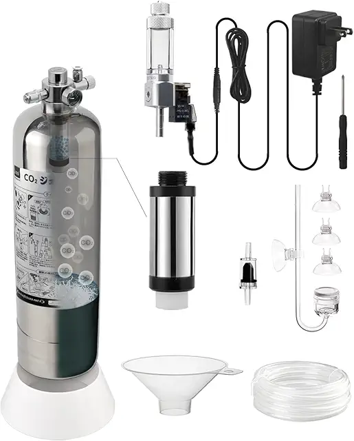 ただし、ペットボトル式など安価なものはその限りではないため、ある程度信頼できるブランド物を買いましょう。私はAmazonでハルデザインが販売している最新モデルを購入しました。大きなトラブルもなく安定して二酸化炭素を供給できています。
