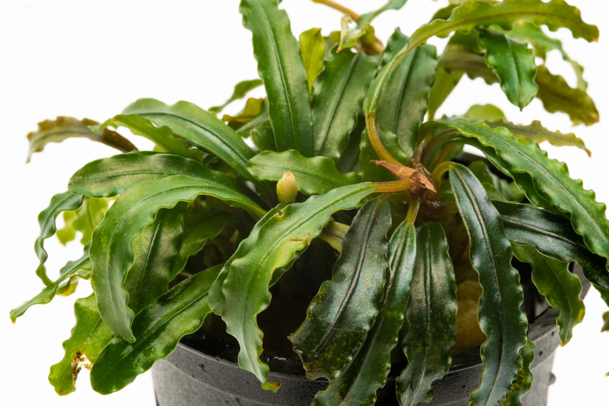 流通量が多く価格も比較的リーズナブルで、入手しやすいため最初の一株として最適な品種です。育成も容易で、弱い光量でも十分に成長します。葉のサイズは4センチから6センチ程度の中型で、前景から中景のレイアウトに適しています。トロピカ社やID便など、複数の輸入元から入手可能で、品質も安定しています。成長速度は遅めですが、活着性が高く流木や石にしっかりと根を張ります。