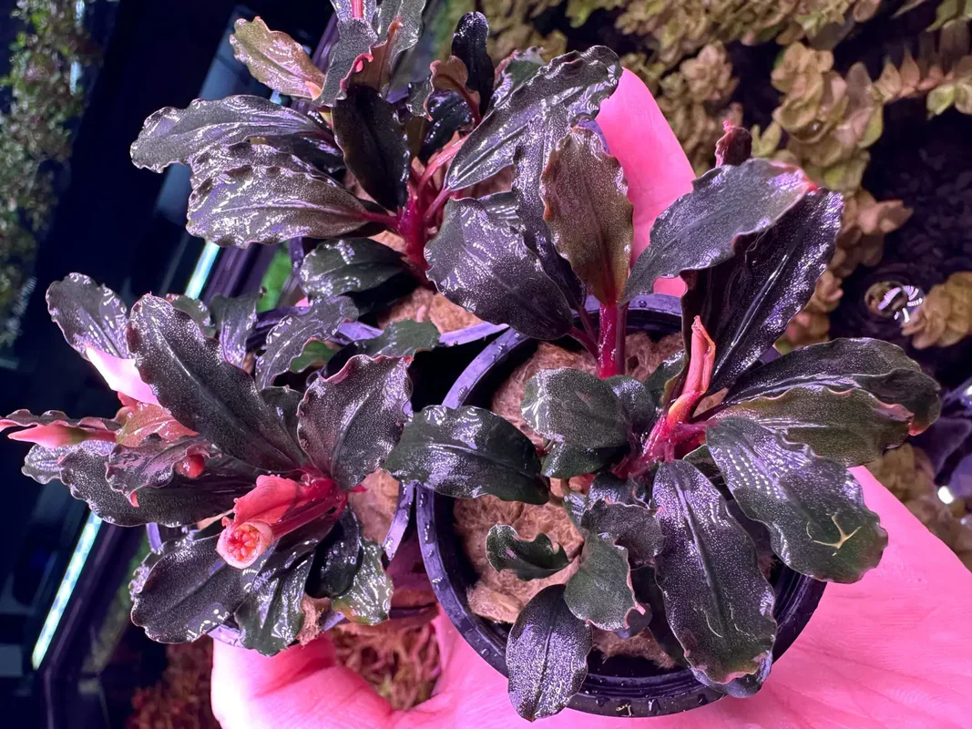 流通量が少なめで価格も高めですが、その希少性と独特の美しさから根強い人気があります。育成難易度は高くありませんが、安定した水質管理が求められます。弱い光量で育ちますが、やや成長が遅い傾向にあります。葉のサイズは中型で、中景に配置するのが効果的です。専門店や通販での入手が主な方法です。成長速度は非常にゆっくりで、長期間かけて育てる品種です。他の明るい色のブセと組み合わせることで、美しいコントラストが生まれます。