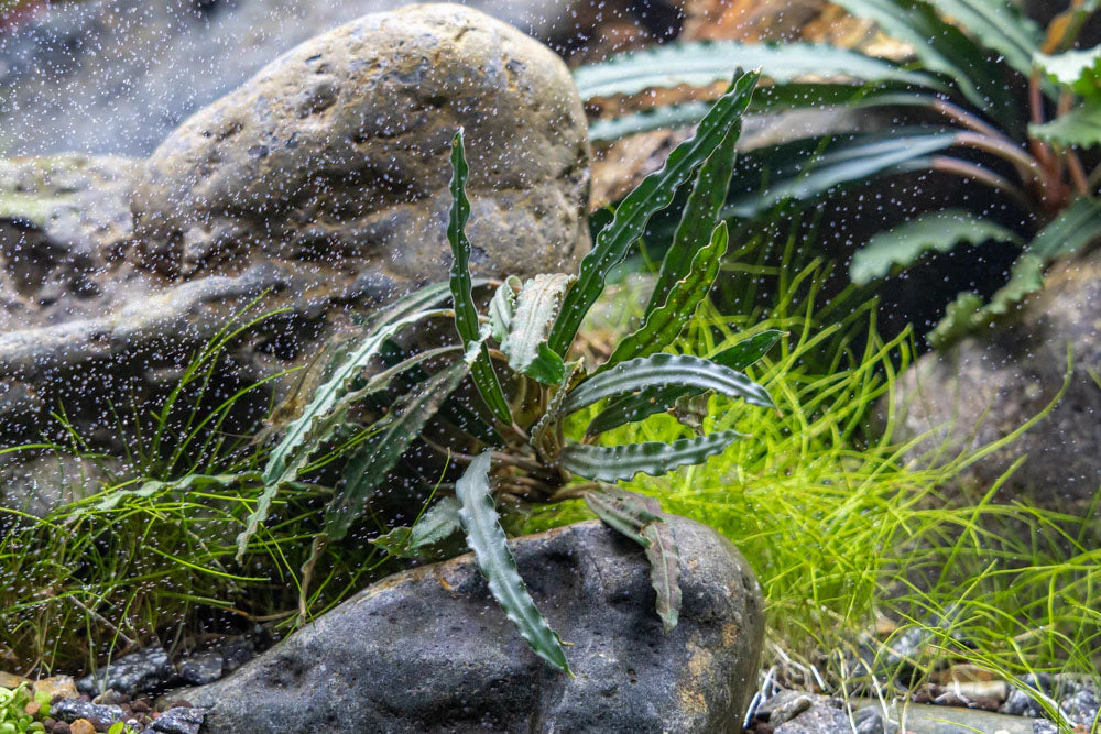 落ち着いた色合いは和風レイアウトにも洋風レイアウトにも合わせやすく、汎用性が高い品種です。育成は容易で、初心者でも安心して育てられます。弱い光量で十分に成長し、CO2添加も必須ではありません。葉のサイズは中型で、前景から中景のどちらにも適しています。価格は中程度で、入手もしやすい部類に入ります。成長速度は遅く、じっくりと時間をかけて育てる楽しみがあります。流木や石に活着させることで、自然な雰囲気のレイアウトが作れます。