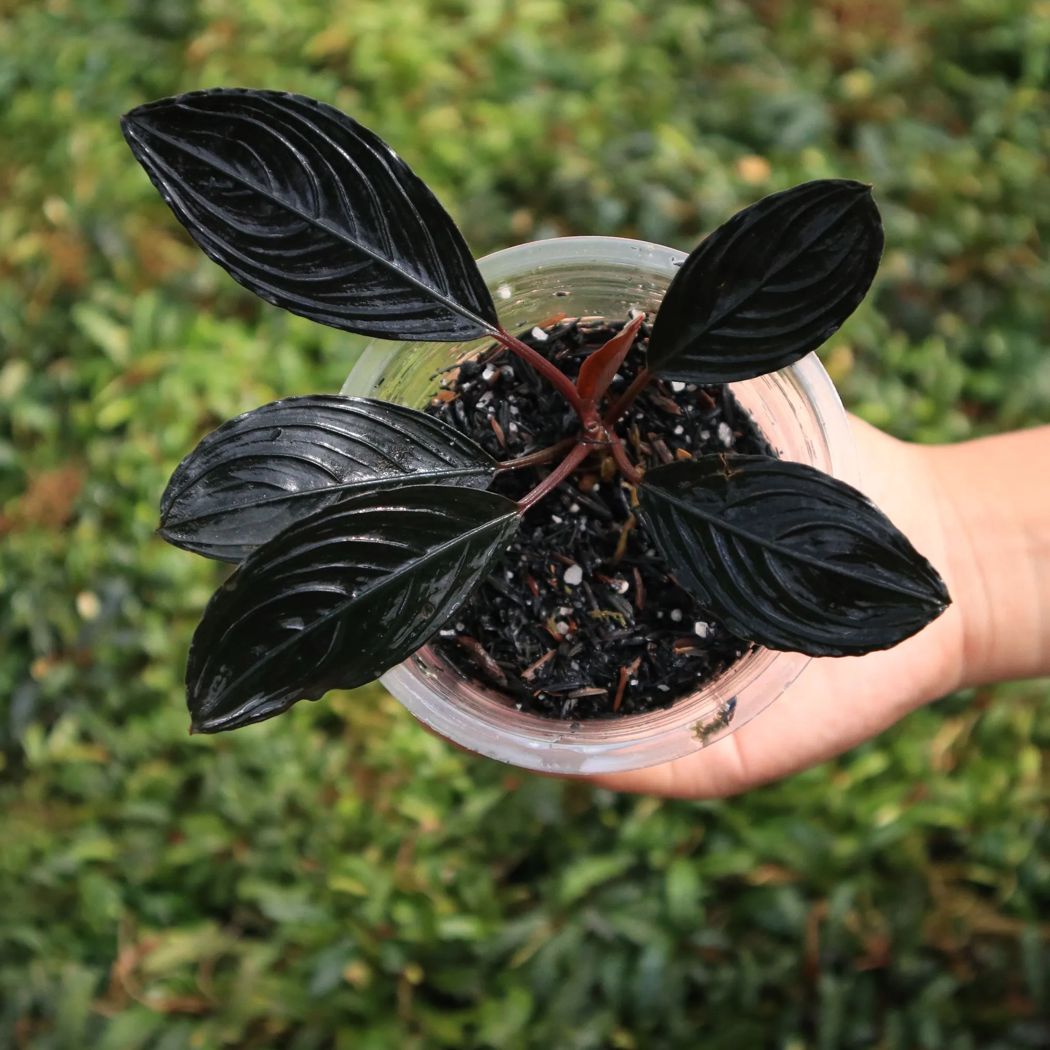 アキレスブラックは暗緑色から黒に近い色の葉を持つダークトーンの品種です。その名の通り、ギリシャ神話の英雄アキレスを連想させる力強い印象を与えます。葉には適度なウェーブが入り、光を当てるとラメが輝きます。