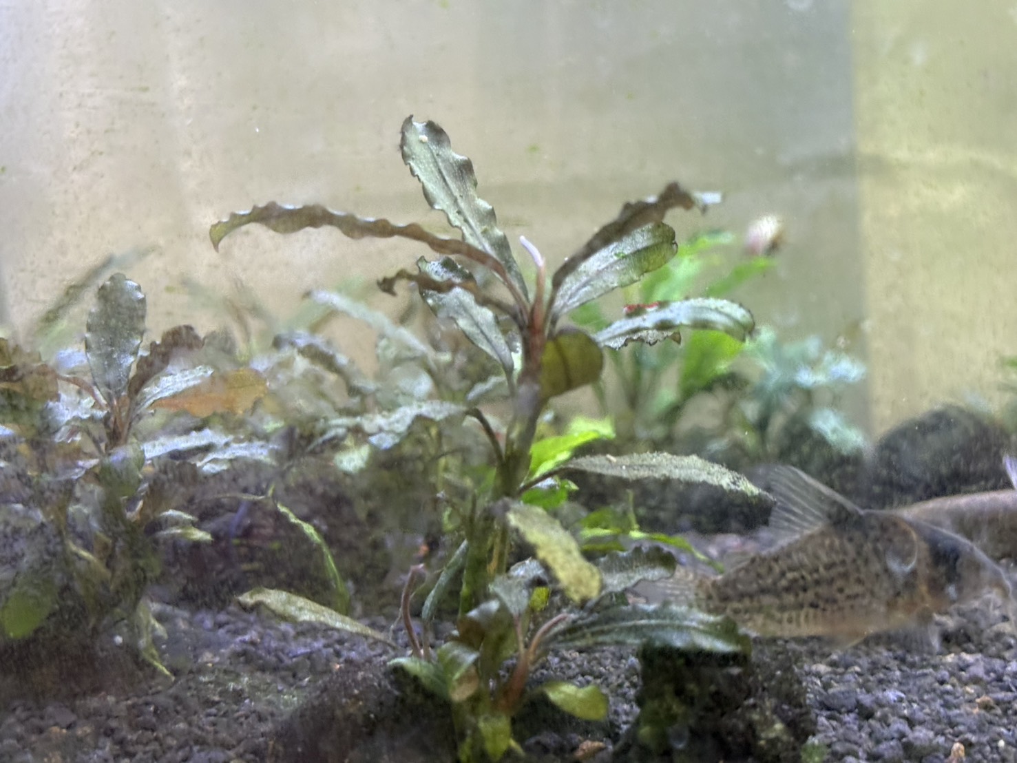 葉の表面にはラメのようなキラキラとした光沢があり、これが水中で美しく輝くことから多くのアクアリストに愛されています。成長速度は非常に遅く、月に1枚から2枚程度しか新しい葉を展開しないため、頻繁なトリミングが不要で管理が楽な点も初心者に向いています。
